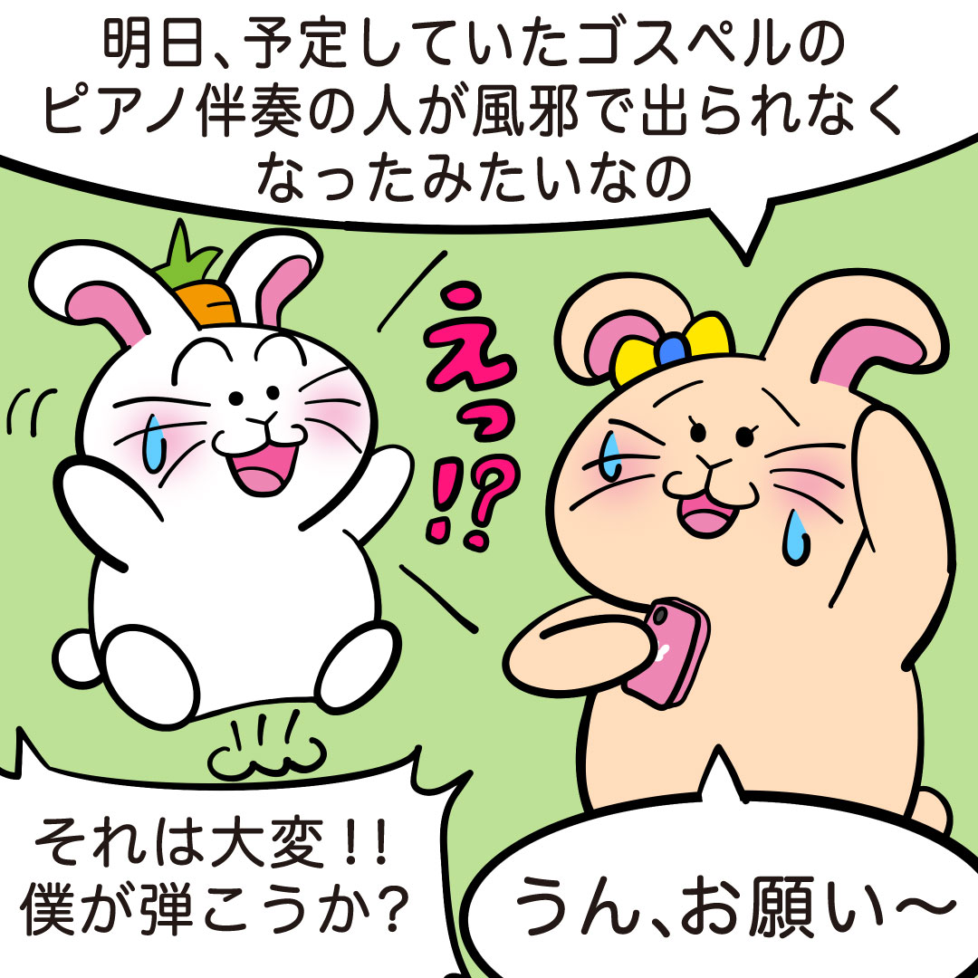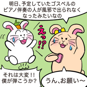 うっきうきピアノ_4コマ漫画_12_02 公開日:2025年12月25日 投稿ナビゲーション ぴょんきちの冒険🎹🐰『うっきうきピアノ』第十二話🐭🎪「【伴奏がいない!?】ぴょんきち、明日ピアノ弾きます。」